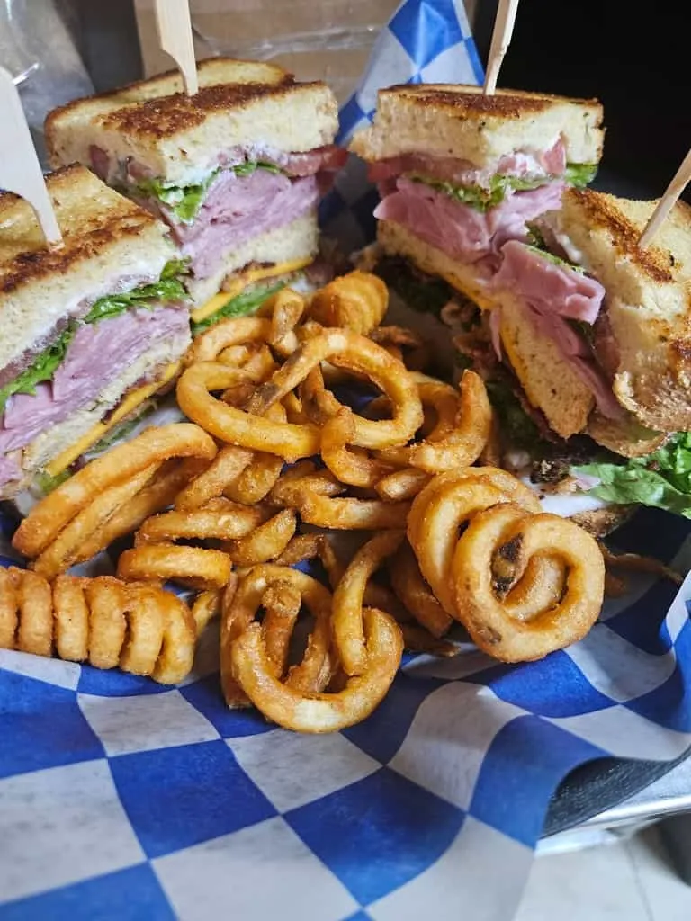 Juicy 1/2 Lb Burger Patty Served On Marbled Rye With Grilled Onions And Choice Of Swiss Or Sharp Cheddar Cheese